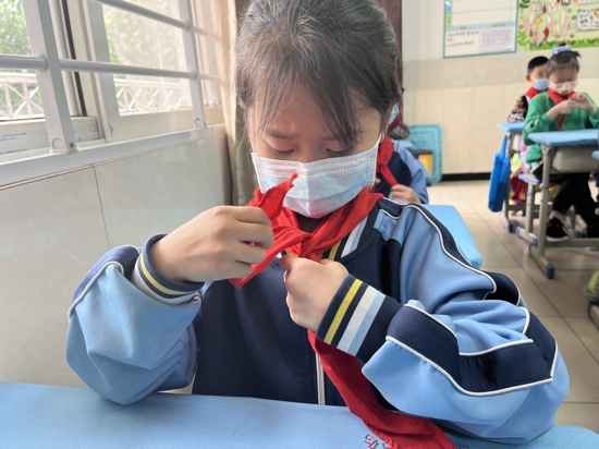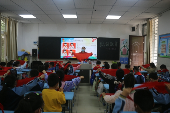 此外,針對入隊前教育的重點“六知六會一做”,老師們分階段、全方位開展了深入的主題教育。輔導員老師通過圖文并茂與實操展示的形式介紹了隊旗、隊徽、紅領巾的來歷等有關隊的知識,讓他們對少年先鋒隊的知識有了更多的了解,知道了少先隊的光榮傳統(tǒng),了解了少先隊的標志及其含義,明白了少先隊員肩負的責任。此外,輔導員老師還帶領隊員們一起練習如何佩戴紅領巾。“紅領巾是革命先烈的鮮血染紅的,我們每一個隊員要熱愛并愛護我們胸前的紅領巾。”輔導員王格格老師向隊員們說道。
