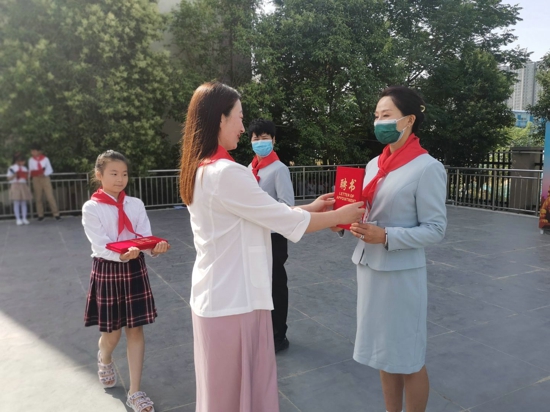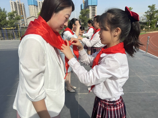 上午8:00,艷陽高照、隊旗飄揚。以“喜迎二十大、爭做好隊員”為主題的新隊員入隊儀式在學校操場上拉開了序幕。少先隊優(yōu)秀代表為參會的學校領導們獻上鮮艷的紅領巾。