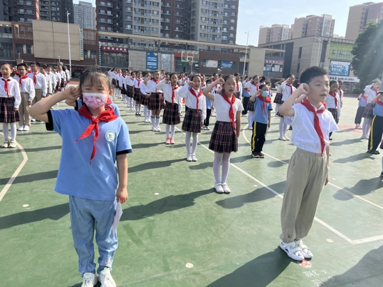 隊員們?yōu)閰膶W校領導帶上紅領巾