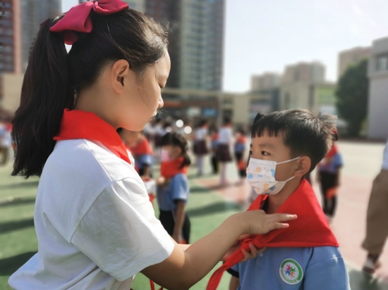 優(yōu)秀隊員代表為他們佩戴紅領巾。