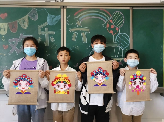 六年級的龍寶收到的是“國粹京劇臉譜”禮物,同學們以小組為單位進行團隊創(chuàng)作。用團隊共同的合作來紀念在五龍口的最后一個兒童節(jié)。