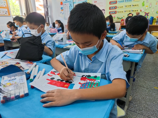 測評在各任課老師的監(jiān)督下有序開展。學(xué)生們聽完考前注意事項,認(rèn)真審題,個個自信地拿起畫筆,起稿作畫,一幅幅生動的作品誕生了。該校美術(shù)教師楊光表示:美術(shù)能力檢測既能檢驗老師的日常美育教學(xué)質(zhì)量,又能考量學(xué)生的繪畫能力。“手捧一張張靈動的畫,可以感知它的分量,這是最珍貴的藝術(shù)品。天馬行空的想象,會讓人忍不住驚嘆童真世界的美妙。”李俊杰老師也說道。