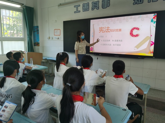 儀式之后,六年級三位班主任老師又為同學(xué)們帶來了精彩的法治課堂,她們用通俗易懂、寓教于樂的講解方式,為學(xué)生們傳授防盜搶、防校園欺凌、交通安全及消防安全、危險感知和逃生自救等方面的常識和技能,提醒同學(xué)們要不斷加強(qiáng)對安全常識的學(xué)習(xí),提高自我保護(hù)的能力。以案說法、以事釋理、憲法知識競賽等活動環(huán)節(jié)深受學(xué)生喜歡。期間,老師頻頻與同學(xué)們互動交流,并對同學(xué)們提出困惑進(jìn)行一一解答。