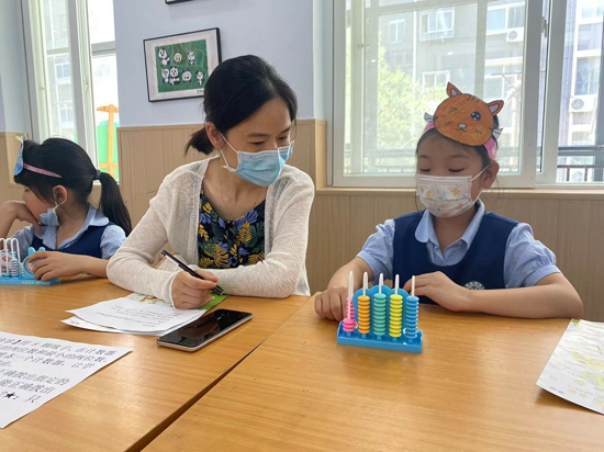 其中,語文學(xué)科重在檢驗(yàn)學(xué)生誦讀課內(nèi)外詩詞、朗讀美文以及書寫的能力。在“書寫繪”環(huán)節(jié)中,學(xué)生通過詩配畫的形式把語文和繪畫融合一體,充分考察了學(xué)生的書寫水平和審美能力。數(shù)學(xué)學(xué)科重在考察學(xué)生的理解能力、語言表達(dá)能力以及解決生活中問題的能力。在“勞動小能手”環(huán)節(jié)中,學(xué)生不僅把書包按不同的分類標(biāo)準(zhǔn)整理的整整齊齊,還能通過簡潔的語言進(jìn)行介紹。這樣的測評內(nèi)容不僅考察了學(xué)生的數(shù)學(xué)素養(yǎng),還體現(xiàn)了學(xué)生的勞動能力。“我真喜歡這樣的測試,每一個關(guān)卡都很有趣,我還通過自己的努力獲得了‘探秘小達(dá)人’稱號呢!”一二班學(xué)生許夢閩開心地說道。