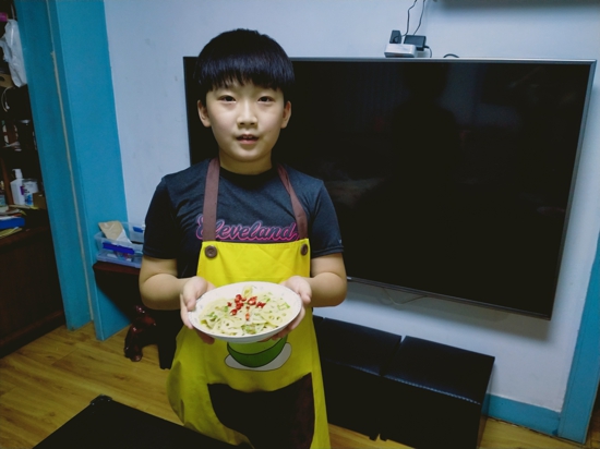 五年級賀耀弘分享道:“在班會課上,我了解到了以前勞動人民有吃頭伏餃子的習(xí)俗。于是,我在媽媽的指導(dǎo)下開始學(xué)習(xí)和面、盤餡兒、包餃子,解鎖了多項新技能。吃著餃子,享受著自己的勞動成果,果然有一種不同尋常的美。”