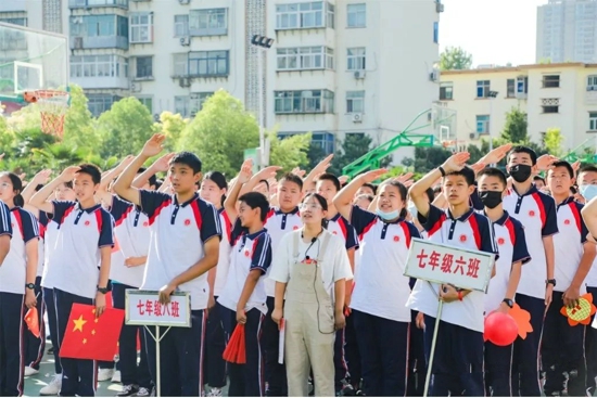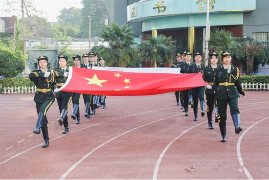 入場完畢后,學生齊聚操場,舉行升旗儀式。鄭州市第十九初級中學國旗護衛(wèi)隊成員眼神堅定,神情肅穆,在莊嚴的國歌聲中,五星紅旗徐徐升起,在全校師生的注目中,迎風飄揚在校園上空。