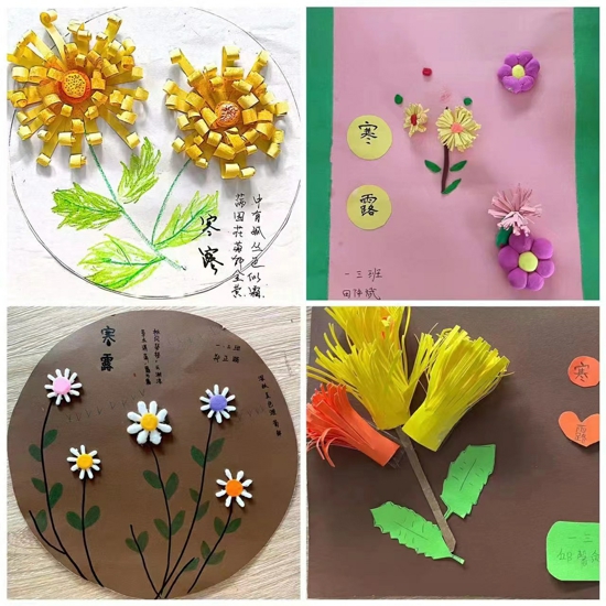 此次活動由語文老師與音樂老師合作開展;顒又,語文老師根據(jù)學(xué)生的年齡和認知特點,開展了“寒露驚秋晚,朝看菊漸黃”的系列寒露節(jié)氣主題活動,活動中,她們通過生動形象的視頻、圖片等形式引導(dǎo)孩子們認識寒露,了解寒露的氣候特點,以及與此相關(guān)的常識、習(xí)俗和農(nóng)事活動等知識。同時,音樂老師不僅在課堂上帶著孩子們聆聽《寒露》的歌曲,還帶著孩子們簡單的學(xué)了這首歌曲的手勢舞。孩子們在了解、感知到寒露的相關(guān)知識后,便通過朗誦寒露節(jié)氣的相關(guān)詩詞和折紙制作寒露時節(jié)最具代表性的花卉“菊花”,來帶領(lǐng)大家感受寒露時節(jié)的秋高氣爽。