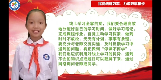 紅領(lǐng)巾小主播們通過國旗下演講,向小伙伴們發(fā)出倡議:在疫情期間,應(yīng)該學(xué)會自律,規(guī)劃好自己的學(xué)習(xí),制定目標(biāo),包括時間作息、學(xué)習(xí)生活、體育鍛煉、興趣愛好等,并為大家提出了一些自律學(xué)習(xí)的好方法。隨后,紅領(lǐng)巾小主播分享了學(xué)生疫情防控期間《居家防護(hù)、學(xué)習(xí)生活健康指南》具體做法,最后,全體隊員面對屏幕集體宣誓,志之所趨,無遠(yuǎn)弗屆。
