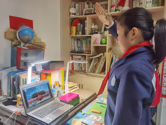 本次升旗儀式的主題為“線上學(xué)習(xí)不松懈,蓄力成長待花開”。雖是“云端”升旗,但大家心心相連,隔著屏幕也同樣感受到這一刻的莊嚴(yán)和神圣。屏幕里,鮮艷的五星紅旗伴隨著國歌聲冉冉升起;屏幕外,師生肅立,高唱國歌,表達(dá)對祖國的深深愛意。隊員們不約而同地向著國旗敬隊禮,目之所向,皆是五星紅旗;歌之所唱,皆是愛國力量。