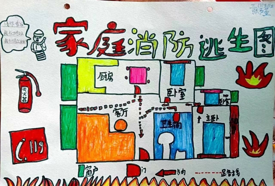 活動中,孩子們與家長一起,根據(jù)家庭的實際布局情況,共同繪制一份家庭逃生路線圖,圖中標明逃生線路及安全出口,可以在火災(zāi)等意外來臨時節(jié)省寶貴的逃生時間。一幅幅圖文并茂的手繪作品,準確標注的房屋布局,詳細的文字介紹,惟妙惟肖的圖片設(shè)計,無不彰顯出孩子們的創(chuàng)意和用心。