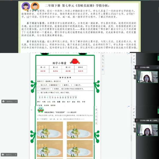 首先,徐小娜老師分享了第一工作坊智慧的結(jié)晶——二年級(jí)下冊(cè)第七單元第6-9課時(shí)的教學(xué)設(shè)計(jì);趩卧黝},圍繞“六一”節(jié)目展演的大情境,深耕共研。為達(dá)成教學(xué)目標(biāo),老師們挖苦心思設(shè)計(jì)了適合低年級(jí)學(xué)情的教學(xué)活動(dòng)——內(nèi)容豐富、環(huán)環(huán)相扣,而且創(chuàng)新設(shè)計(jì)了助學(xué)工具——預(yù)學(xué)小錦囊、青蛙過河、泥塘變形記、百變?cè)煨蛶煹葘W(xué)習(xí)手冊(cè),受到老師們的嘖嘖稱贊!