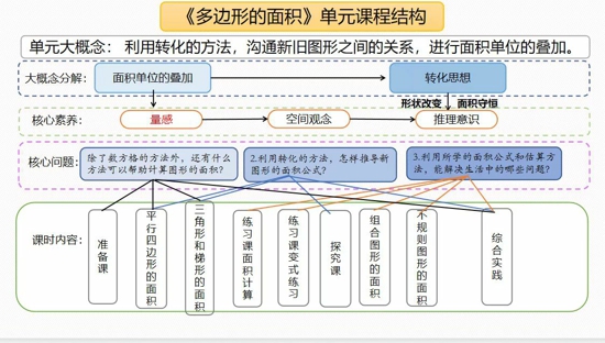 接著,第二組由季艷枝老師進(jìn)行匯報(bào)。對(duì)核心素養(yǎng)進(jìn)行再次整合,保留了推理意識(shí)和空間觀念,對(duì)量感究竟是否保留提出疑問(wèn)!最后季老師呈現(xiàn)了清晰明了的單元課程結(jié)構(gòu)圖為后續(xù)的單元整體教學(xué)研究提供了明晰的思路。