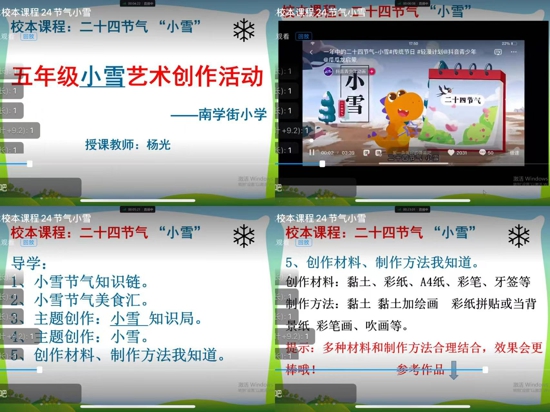 活動前,學(xué)校老師為學(xué)生精心制作了節(jié)氣宣講視頻,帶領(lǐng)學(xué)生了解了小雪節(jié)氣的由來、氣候特點、物候特征、民間習(xí)俗等,讓學(xué)生在愉快的觀賞中了解、感悟小雪節(jié)氣,讓祖國的傳統(tǒng)歷史文化與美德能代代弘揚與傳承,讓民族文化根植于每個學(xué)生的心田。