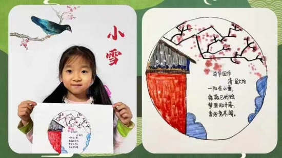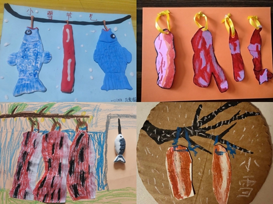 活動中,孩子們在老師的指導(dǎo)帶領(lǐng)下,在家長的幫助下積極參與。語文學(xué)科中,孩子們在老師的帶領(lǐng)下探索與小學(xué)節(jié)氣有關(guān)的詩詞并進行朗誦并制作了小學(xué)主題的詩配畫,一起感受那詩韻般的小雪之美;美術(shù)學(xué)科中,老師給孩子們講述小學(xué)節(jié)氣的民俗藝術(shù)活動知識并帶領(lǐng)大家一起創(chuàng)作“曬魚干”“黏土雪人”“臘肉拼貼畫”等美術(shù)作品,讓孩子們在充分了解節(jié)氣知識的同時豐富美術(shù)創(chuàng)作體驗;科學(xué)學(xué)科則開展了創(chuàng)意實踐給小樹穿衣、冷熱空氣對流、人工造雪等科學(xué)小實驗,極大地調(diào)動了孩子們的參與積極性;音樂學(xué)科則一起學(xué)習(xí)節(jié)氣歌、表演手勢舞,感受節(jié)氣的別樣韻味;還有勞動課堂上,各班紛紛開展了做糍粑、做臘肉、刨肉湯等勞動實踐活動,引導(dǎo)孩子們對小學(xué)節(jié)氣的勞動活動有了更深一步的了解。