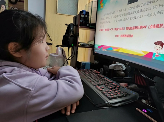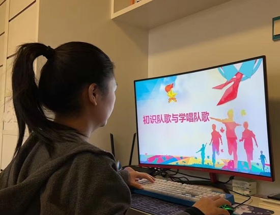 活動(dòng)開始前,音樂老師鄭鵬慧先向一年級(jí)同學(xué)們介紹了隊(duì)歌的創(chuàng)作背景以及隊(duì)歌的變遷,她告訴孩子們在舉行入隊(duì)儀式、召開隊(duì)會(huì)等少先隊(duì)活動(dòng)時(shí),少先隊(duì)員和輔導(dǎo)員老師都要齊唱隊(duì)歌。在講解隊(duì)歌變遷的過程中,鄭老師帶領(lǐng)孩子們一起在線欣賞了新老隊(duì)歌,讓隊(duì)員們對隊(duì)歌有了更深的了解。同時(shí),結(jié)合隊(duì)歌的變遷,鄭老師告訴孩子們新隊(duì)歌來源于革命紅色電影《英雄小八路》并給隊(duì)員們講述了其背后的感人故事。鄭老師告訴隊(duì)員們:英雄小八路的故事原型是廈門何厝小學(xué)的13位少先隊(duì)員,在金門炮戰(zhàn)中一邊在硝煙彌漫中堅(jiān)持學(xué)習(xí),一邊深入前線支援革命戰(zhàn)斗的故事,而新隊(duì)歌就是電影《英雄小八路的主題曲》。“隊(duì)歌的含義就是要告訴我們每一名少先隊(duì)員向英雄小八路這樣的少年先鋒榜樣學(xué)習(xí),繼承革命先輩的光榮傳統(tǒng),努力奮斗,取得一個(gè)個(gè)新的偉大成就。”鄭鵬慧說道。