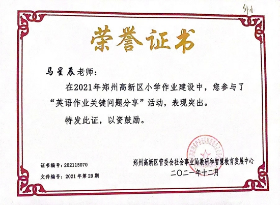 空余時(shí)間,她積極參加各類(lèi)教育教學(xué)培訓(xùn)活動(dòng),深入學(xué)習(xí)教育教學(xué)新理念,堅(jiān)持閱讀教育類(lèi)專(zhuān)著以提升自身專(zhuān)業(yè)素養(yǎng),將理論學(xué)習(xí)與教育教學(xué)實(shí)踐相結(jié)合。在學(xué)校組織的教師基本功大賽、優(yōu)質(zhì)課評(píng)選等活動(dòng)中,她總能獨(dú)樹(shù)一幟;在高新區(qū)組織的單元教學(xué)設(shè)計(jì)、作業(yè)建設(shè)研討活動(dòng)中,她分享的“英語(yǔ)作業(yè)關(guān)鍵問(wèn)題”引發(fā)共鳴,效果突出。