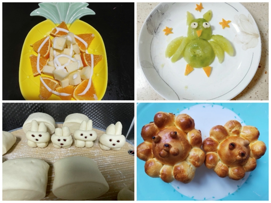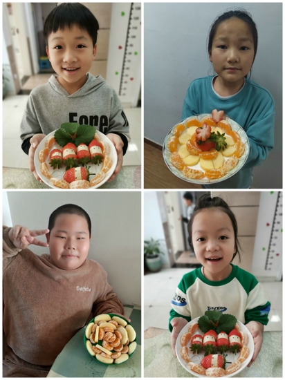 小手準(zhǔn)備好食材,樂享廚藝我最棒。一二年級的小嫩芽們積極參與,各顯神通,跟著爸爸媽媽學(xué)習(xí)簡單的烹飪技能。擇菜、洗菜,搟餃子皮、包餃子,削水果、擺拼盤……巧手慧心,分享美食。瞧!這些富有創(chuàng)意的果蔬拼盤、美味甜點,都出自小嫩芽們靈巧的小手哦,一起來為他們點贊吧!