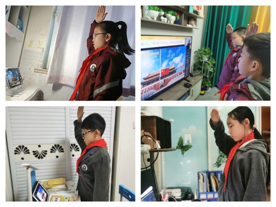 居家防疫不忘使命,心系祖國(guó)你我同行。伴隨著嘹亮的國(guó)歌聲,五星紅旗冉冉升起。全體師生肅然而立,滿懷自豪和熱愛向國(guó)旗敬禮,共赴國(guó)旗之下的莊嚴(yán)約定。