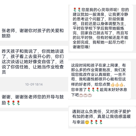 一枝一葉總關(guān)情,一點一滴見初心。張老師把班級當成了家,把學生當成了自己的孩子。一句“老師想你了!”拉近了她與學生的距離;一聲“在家還好嗎?”給予了學生滿滿的溫暖。當?shù)弥嗉売幸粋孩子的媽媽因工作外出,而不得不獨自上網(wǎng)課時,張老師很是擔心。于是她想盡辦法聯(lián)系孩子,每天通過視頻電話溝通思想,指導學習。在張老師無微不至的關(guān)心下,這個孩子沒有落下一節(jié)課,沒有漏交一次作業(yè)。