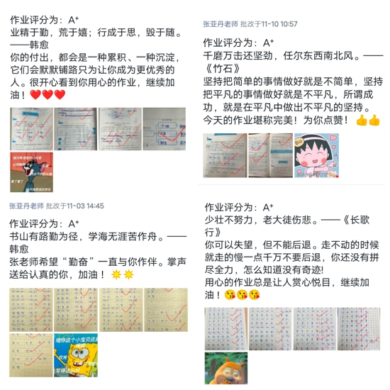 張老師認為作業(yè)是與學生溝通的良好機會,因此,她每天及時認真批閱每一份作業(yè)。對于有問題的作業(yè)一對一反饋,對優(yōu)秀作業(yè)不吝嗇鼓勵,對進步明顯的學生給予充分肯定。為了充分發(fā)揮作業(yè)的評價育人功能,她創(chuàng)新作業(yè)評語,或使用學生感興趣的表情包,“你是最棒的仔”“你的作業(yè)自帶光環(huán)”;或是送給學生一句充滿哲理的詩句,“書山有路勤為徑,學海無涯苦作舟。”“少壯不努力,老大徒傷悲。”又或是精心制作電子獎狀頒發(fā)給作業(yè)優(yōu)秀的學生,以此給予學生充分的成就感和滿滿的儀式感,勉勵學生勤奮努力、積極進取。