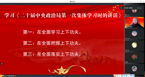 會上,支部書記李莉娟同志帶領(lǐng)全體黨員教師認真學習《在二十屆中央政治局第一次集體學習時的講話》。文章強調(diào),學習宣傳貫徹黨的二十大精神是當前和今后一個時期全黨全國的首要政治任務(wù),要在全面學習上下功夫,要在全面把握上下功夫,要在全面落實上下功夫。接著,全體黨員教師學習了《黨支部標準化規(guī)范化建設(shè)》第一講。組織委員王紅濤同志說:“我們要結(jié)合自身實際情況,拿出行動。在新學期的工作中不斷突破自己,提升自己。”最后,支部書記李莉娟同志對全體黨員教師提出新學期要求:“要求黨員教師堅持政治學習和業(yè)務(wù)學習,做學習型教師;對自己的工作是什么、干什么、怎么干要做到心中有數(shù);在集體中講團結(jié)、講原則、講奉獻;要以終身學習、務(wù)實創(chuàng)新、以德立身和弘揚正氣的形象在新學期煥發(fā)新氣象,展現(xiàn)新作為。”