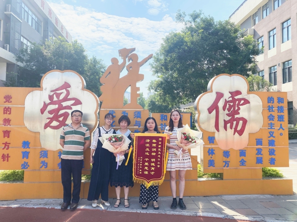 錦旗,代表著榮譽,是對老師最高的褒獎;代表著認(rèn)可,是對學(xué)校最大的肯定。散學(xué)典禮這天,三位家長代表將印著“桃李滿天下授教固有方”“春雨潤物明德育才澤流及遠(yuǎn)千里思源”“疼愛無微不至關(guān)懷教導(dǎo)有方”“好習(xí)慣陪伴終生好老師影響一生”燙金大字的錦旗送到學(xué)校,以此表達對學(xué)校、對任課老師關(guān)愛孩子、無私奉獻的感激之情,一股暖意涌上心頭。兩個班的任課老師對家長們表示感謝并合影留念。