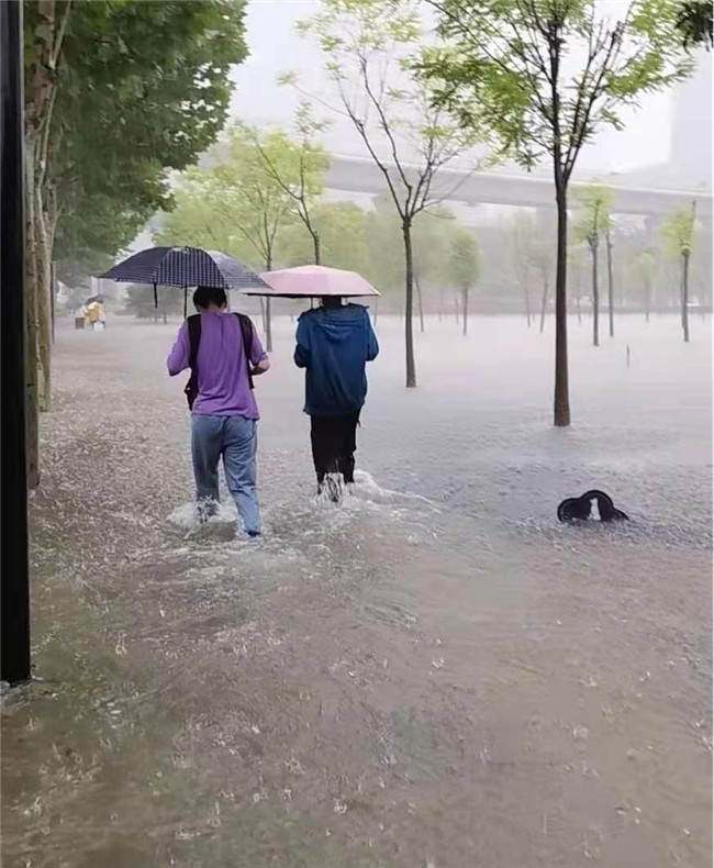 7月21日早上,學(xué)校內(nèi)積水已過小腿,學(xué)院副院長史岳鵬和指導(dǎo)老師李騫冒著大雨,蹚水給他們送去物資,并堅(jiān)持陪同保證安全。