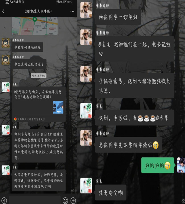 學(xué)生安全抵達(dá)后,李騫老師向能源與智能工程學(xué)院匯報(bào)了五名學(xué)生情況以及兩名留在學(xué)校繼續(xù)完成實(shí)驗(yàn)工作的學(xué)生。學(xué)院領(lǐng)導(dǎo)萬分關(guān)注學(xué)生動(dòng)向與安全,及時(shí)與學(xué)生取得聯(lián)系。此刻學(xué)校內(nèi)積水嚴(yán)重,頂樓漏雨,整棟樓停水停電,學(xué)生面臨缺水?dāng)嗉Z的境地。彭勃老師收到信息后立即趕往學(xué)校,由于汽車進(jìn)水,換用共享單車,中途差點(diǎn)掉進(jìn)下水井里,摔倒后不顧全身濕透,冒雨去學(xué)校給兩位學(xué)生送充電寶。