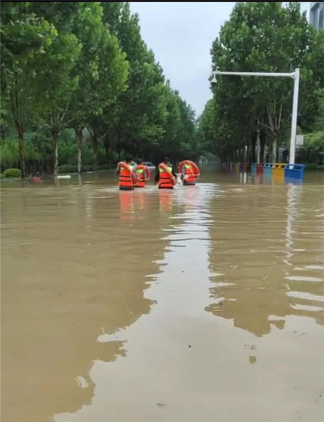 接到消息后,學(xué)校保衛(wèi)處迅速組織力量前往解救被困人員。當(dāng)營救車輛行駛至鄭開大道與楊橋大道交叉口時,積水已經(jīng)達(dá)到1米以上。營救小隊當(dāng)即決定冒險涉水前行,解救被困人員。