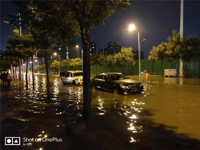 7月21號晚,會計2001班岳漢在濮陽市華龍區(qū)蘇北路中段,將兩位被困人員和車輛轉(zhuǎn)移至安全區(qū)域。
