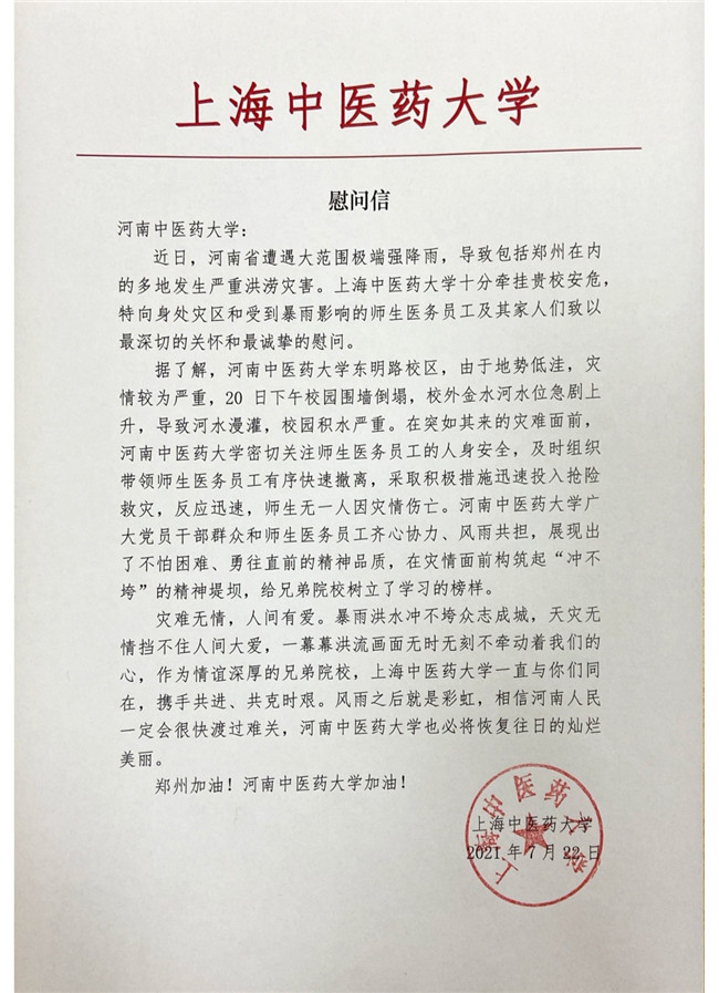 中新河南網(wǎng)7月25日電(魏豪)編者按:2021年7月22日,一封飽含兄弟院校深厚情誼的上海中醫(yī)藥大學給河南中醫(yī)藥大學的慰問信從一千公里之外的上海深情到來!信中,上海中醫(yī)藥大學向身處災區(qū)和受到暴雨影響的河南中醫(yī)藥大學師生、醫(yī)務員工及其家人們致以最深切的關懷和最誠摯的慰問,對河南中醫(yī)藥大學廣大黨員干部群眾和師生醫(yī)務人員齊心協(xié)力、風雨共擔,采取有力措施保護師生生命財產(chǎn)安全和取得的成效給與了鼓勵、激勵,對兩所大學攜手共進、共克時艱給與了堅強有力的支持,滿滿的深情厚誼!滿滿的關心牽掛!滿滿的祝愿祝福!滿滿的能量力量!在全校上下眾志成城防汛救災的關鍵時刻,上海中醫(yī)藥大學發(fā)來的慰問信,為河南中醫(yī)藥大學全面做好防汛救災工作注入了強勁力量,進一步堅定了全校師生防汛救災、共克時艱的信心和決心。