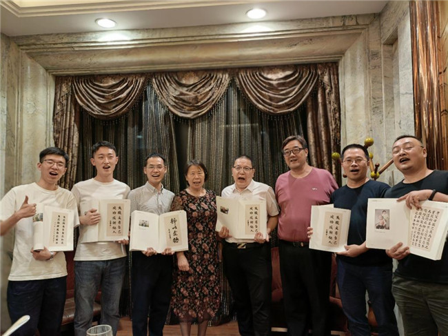 (執(zhí)行董事王新奇、校長郭愛先為校友贈送《王廣亞書畫作品集》并合影留念)