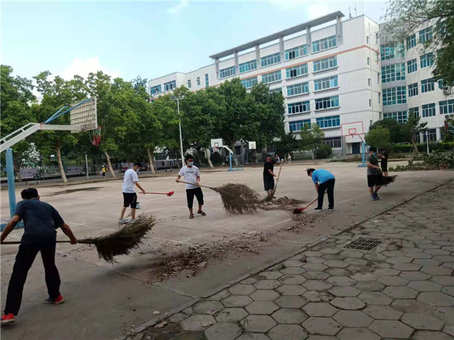 “你們?nèi)セ@球場(chǎng)清理綠地上的枯枝落葉,我們?cè)谶@邊清掃路面雜物……”楊寶進(jìn)一行帶領(lǐng)教師志愿者,從學(xué)生公寓門口出發(fā),分為南、北兩隊(duì),分別對(duì)校園內(nèi)、第一家屬區(qū)、第二家屬區(qū)等地汛后遺留的垃圾物進(jìn)行全面清理打掃。老師們拿起掃帚,一邊清理路面的淤泥,一邊清掃路面的落葉及雜物,力爭(zhēng)盡快恢復(fù)校容校貌。清掃過程中,大家分工明確,方法得當(dāng),效果明顯,校園的路面、大門口、教學(xué)樓廣場(chǎng)等處,很快恢復(fù)了往日的良好面貌。