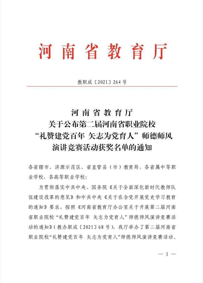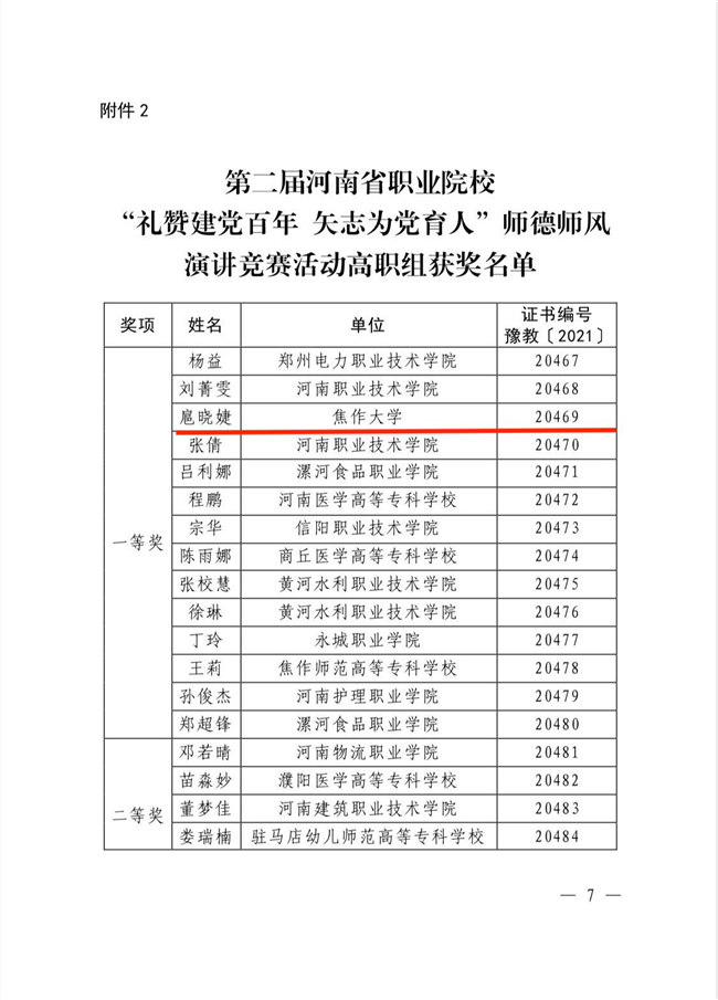 中新河南網(wǎng)7月30日電(魏豪)為貫徹落實(shí)中共中央、國務(wù)院《關(guān)于全面深化新時代教師隊(duì)伍建設(shè)改革的意見》和中共中央《關(guān)于在全黨開展黨史學(xué)習(xí)教育的通知》要求,河南省教育廳于近期開展了第二屆河南省職業(yè)院校“禮贊建黨百年 矢志為黨育人”師德師風(fēng)演講競賽活動。焦作大學(xué)人文學(xué)院教師扈曉婕獲得高職組一等獎,高婷婷獲得二等獎。