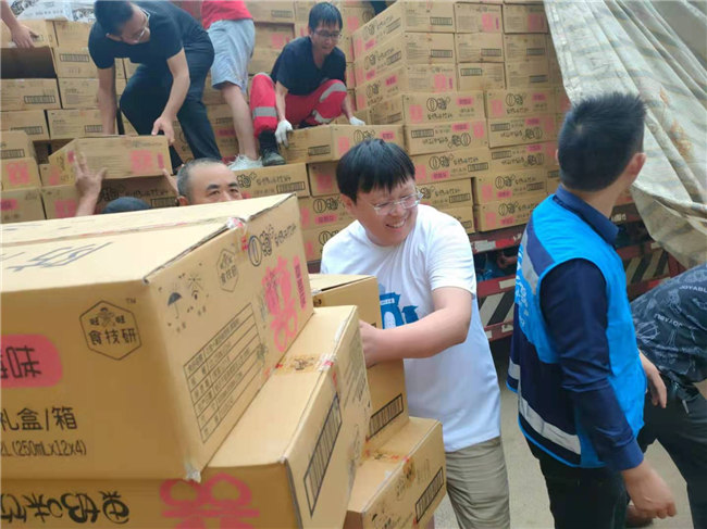 會計學(xué)院教師黨員何保國教授時刻牢記發(fā)揮黨員的先鋒模范作用,積極聯(lián)絡(luò)各方,主動參與到鄭州市二七區(qū)青年志愿者服務(wù)工作中,在二七區(qū)地方糧食儲備庫裝卸、分裝全國各地運送至鄭州的援助物資。在7月24日、25日兩天時間里,他與其他志愿者一起,共裝卸、轉(zhuǎn)運瓶裝水逾3000件、香菇醬100件、救援藥品300箱。