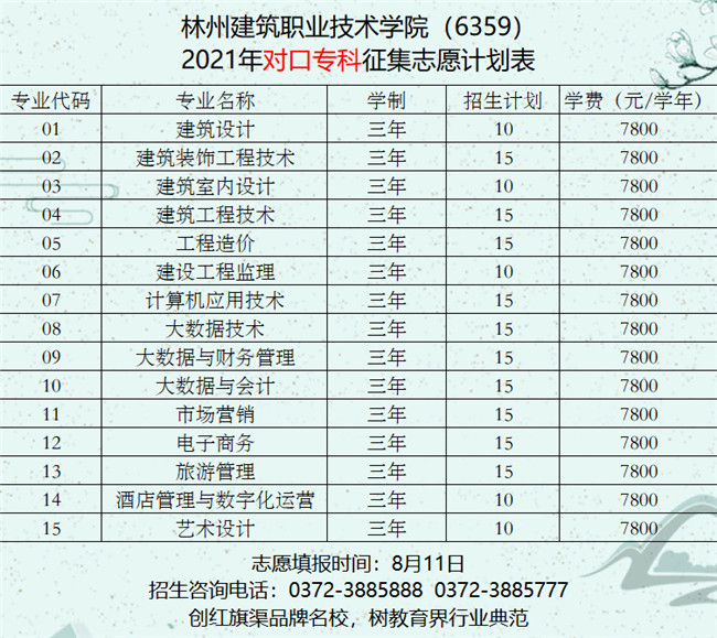 中新河南網(wǎng)8月9日電(魏豪)重要通知!河南特色高職院校——林州建筑職業(yè)技術(shù)學(xué)院(6359)對(duì)口?、藝術(shù)?菩略鲇(jì)劃征集志愿!