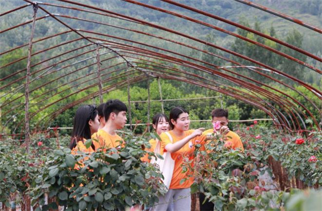 花瓣微微下卷,層層疊疊。在艷陽的照耀下,月季花瓣猶如涂上了一層明油,飽滿而富有光澤。隊員們拿出手機,迫不及待地想要按下快門把月季的綻放姿態(tài)同連綿起伏的山川一起記錄下來。離開時,調(diào)研隊隊員們紛紛表示,月季種植區(qū)內(nèi)的優(yōu)美景色令人意猶未盡,以天為被,以地為床,月季花香隨微風陣陣襲來,令人心曠神怡。