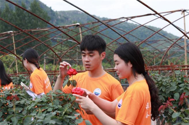月季,被稱為花中皇后,又稱月月紅、長春花。月季的顏色不僅有紅、粉、黃、白等單色,還有混色等品種。進村的路上,隊員們想到了很多有關月季的優(yōu)美詩句,唐代著名詩人白居易曾寫道“晚開春去后,獨秀院中央”。滿懷極大的好奇心,隊員們跟隨著當?shù)胤N植戶王付順走進了他的月季種植區(qū),一睹月季風采。