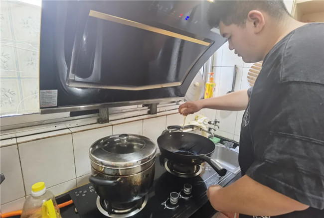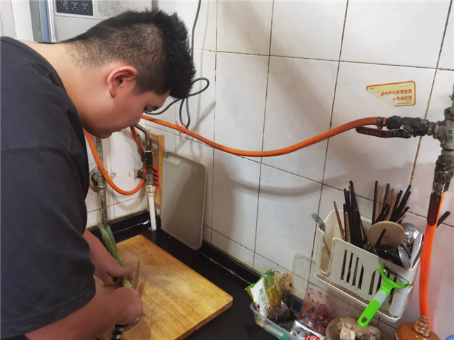 由于父母都在參與抗疫一線(xiàn)工作,在家閑暇的一博,除了看書(shū),還學(xué)會(huì)了做飯:切蔥,香腸,炒雞蛋,加上隔夜飯,一份香噴噴的炒米就出鍋啦。