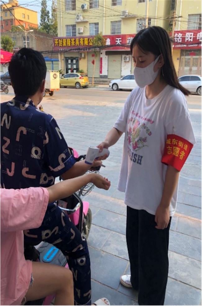 在進行了規(guī)范的志愿服務(wù)培訓(xùn)后,張鑫雨如愿加入疫情防控工作隊伍。她了解到開封市城東街道管轄人員一百多人,要排查祥符區(qū)幾十萬人口,任務(wù)艱巨,同樣也很神圣。她帶著使命感加入這次防控疫情大家庭中,一方面把業(yè)主卡發(fā)放到位,量測居民體溫,戶主填寫信息以及簽訂疫情防控承諾書,查驗行程碼和健康碼,發(fā)現(xiàn)碼異常人員及時溝通。另一方面,協(xié)助城東街道辦事處,組織群眾做核酸檢測,維持隊伍秩序,保持距離提醒,防疫知識宣傳。