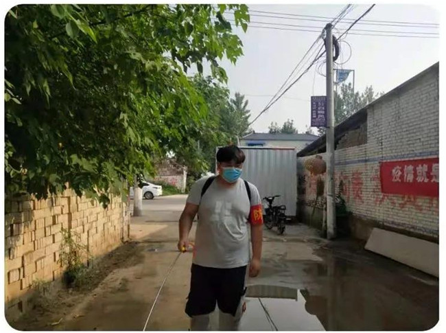 剛剛挨家挨戶統(tǒng)計完外來人員信息,汗水未干,汽車與航空工程學(xué)院新能源汽車技術(shù)1903班張浩又背起消殺器材對自己所在的濮陽縣清河頭鄉(xiāng)東大韓村的各個角落,進全面行消殺,尤其是村里廣場、健身器材、菜市場等位置進行了重點消殺,不放過任何一個地方,不留一個死角,確保村莊能夠安全防控新冠肺炎病毒和其他病毒細(xì)菌的侵害,他用噴霧器為居民和病毒之間撐起了一把保護傘,為家鄉(xiāng)平安吹起沖鋒號。