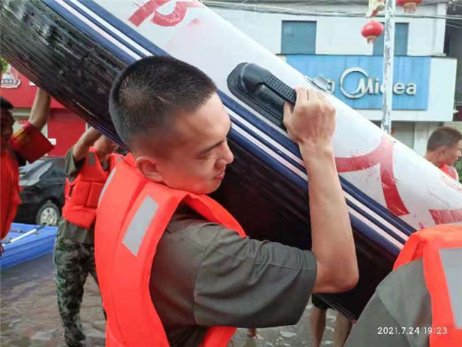 因降水量北移,田留青直接奔赴較為嚴(yán)重的新鄉(xiāng)地區(qū),到達(dá)集合地已經(jīng)是凌晨一點多。很快,他便接到命令去鳳泉區(qū)陳堡村轉(zhuǎn)移受災(zāi)群眾并為他們運送生活物資。連續(xù)的強降雨造成當(dāng)?shù)亟煌òc瘓、水利電力受損,加上該自然村村民較多,地形復(fù)雜,救援群眾、運送物資難度較大。每次只能將沖鋒舟停到村口位置,再用小艇向村子縱深內(nèi)部挨家挨戶送物資。有的地方狹窄偏僻,船行不便,就必須直接下船進(jìn)到積水中前行。最深處的水甚至沒過胸膛,在里面行走阻力很大,十分費力。一天下來,田留青累得筋疲力盡,嗓子也喊得沙啞,但他從來沒有叫過苦。