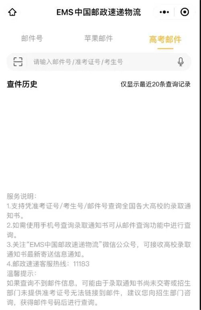 通知書狀態(tài)簡單可查,利用微信查詢:進(jìn)入微信公眾號(hào),并關(guān)注:中國郵政速遞物流,公眾號(hào)關(guān)注后,輸入“準(zhǔn)考證號(hào)碼”或“手機(jī)號(hào)碼”進(jìn)行查詢
