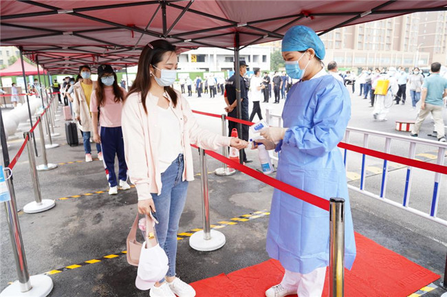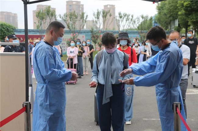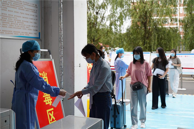 在學(xué)校南大門,防疫工作人員恪盡職守,入校流程規(guī)范嚴(yán)謹(jǐn)。學(xué)生持學(xué)生證或校園一卡通進(jìn)行身份核驗(yàn),出示通信形成大數(shù)據(jù)卡、防疫健康信息碼和48小時內(nèi)核酸檢測陰性證明,進(jìn)行測溫以及行李、腳底和手消毒,更換口罩后進(jìn)入校園。
