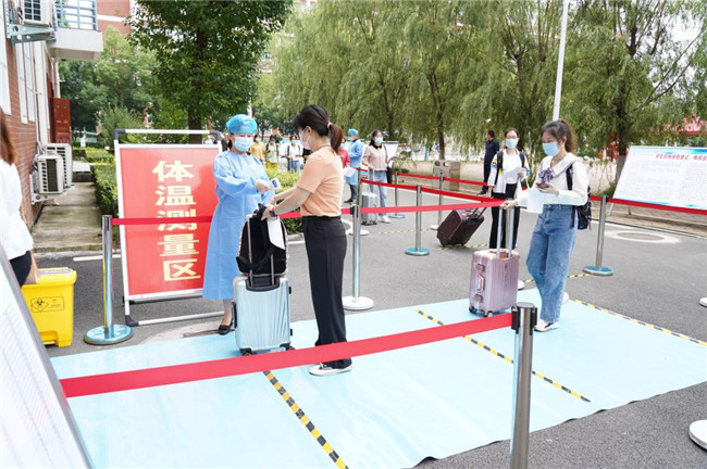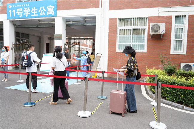 在學(xué)生公寓,學(xué)生進(jìn)入公寓的流程及注意事項(xiàng)等展板迎面可見,學(xué)生陸續(xù)報到入住,工作人員在學(xué)生公寓入口處查驗(yàn)學(xué)生身份及健康碼,完成體溫檢測、殺菌消毒等程序后,學(xué)生保持1米間距有序進(jìn)入公寓。