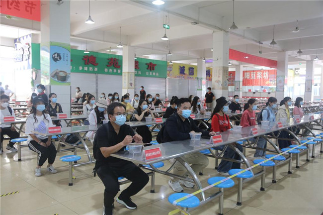在餐廳門前,醒目的疫情防控宣傳展板、就餐流程圖、溫馨提示牌引導(dǎo)學(xué)生有序購餐、用餐。演練開始后,就餐人員按照指引洗手、排隊、測溫消毒后進(jìn)入餐廳,在就餐窗口前一米線排隊取餐,單人單桌同向入座就餐。