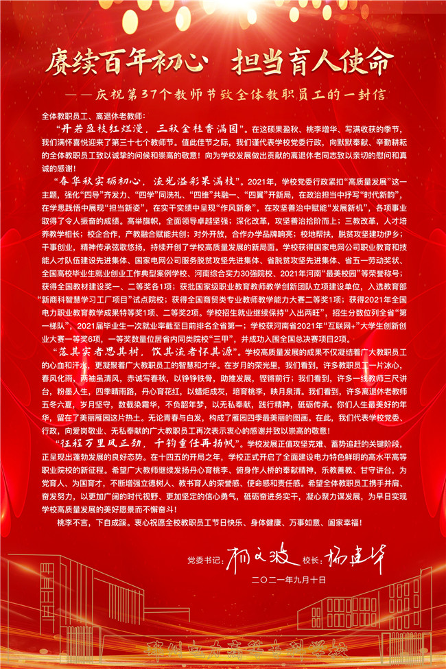 今年教師節(jié),鄭州電專慶祝活動以“賡續(xù)百年初心,擔(dān)當(dāng)育人使命”為主題,求真務(wù)實(shí)、勤儉節(jié)約、隆重簡樸地開展教師節(jié)各項(xiàng)活動,展現(xiàn)全校教師隊(duì)伍良好精神風(fēng)貌,營造尊師重教的良好校園氛圍。
