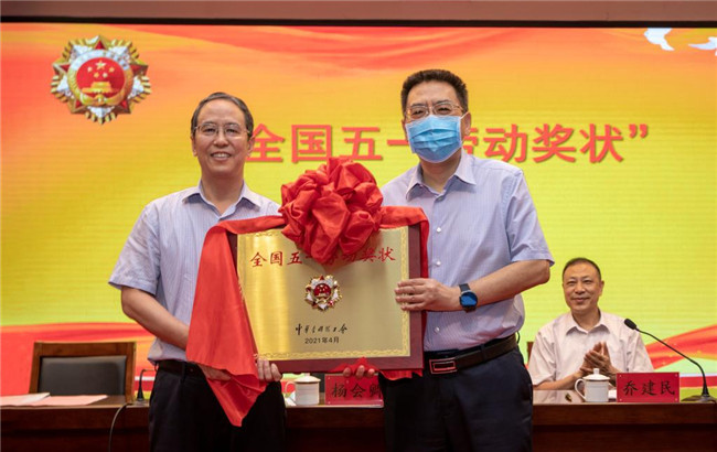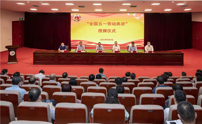 授牌儀式上,喬建民宣讀了中華全國總工會《關于表彰2021年全國五一勞動獎和全國工人先鋒號的決定》;楊會卿為學校頒發(fā)“全國五一勞動獎狀”,并代表省總工會向學校表示熱烈祝賀,向學校全體教職工致以教師節(jié)問候和美好祝福,向一直以來關心支持工會工作的學校領導和廣大教職工以及多年來為工會工作作出貢獻的廣大工會干部表示衷心的感謝。
