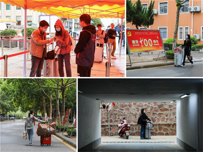 上午9時(shí)許,校領(lǐng)導(dǎo)一行前往學(xué)校西門口巡視學(xué)生返校防疫工作,走訪慰問返校學(xué)子、工作人員和志愿者,叮囑同學(xué)們要做好自我防護(hù),盡快適應(yīng)返校生活,在學(xué)習(xí)的同時(shí)做好自身防疫衛(wèi)生。學(xué)校按照“分期、分批、錯(cuò)時(shí)、錯(cuò)峰”原則,合理安排各年級(jí)學(xué)生入校報(bào)到開學(xué)。返校首日為金貿(mào)學(xué)院、會(huì)計(jì)學(xué)院、管理學(xué)院、藝術(shù)學(xué)院的約3800余名大四學(xué)生。他們冒著淅瀝的秋雨,頂著寒風(fēng),戴著口罩,拉著行李,懷著激動(dòng)的心情陸續(xù)返校。