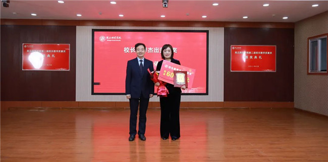 陳向煒與校長(zhǎng)教學(xué)杰出貢獻(xiàn)獎(jiǎng)獲得者楊靜頒獎(jiǎng)合影